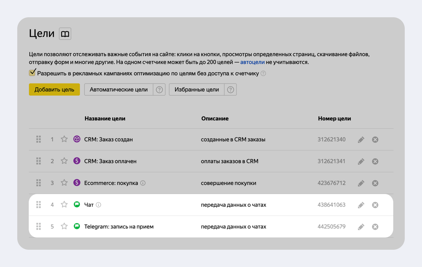 При первой загрузке данных о чат-конверсии в Метрике автоматически создаётся специальная цель типа «Чат». Она появится на странице управления целями и позволит отслеживать обращения без дополнительных настроек. Название цели может выглядеть как «Чат».
